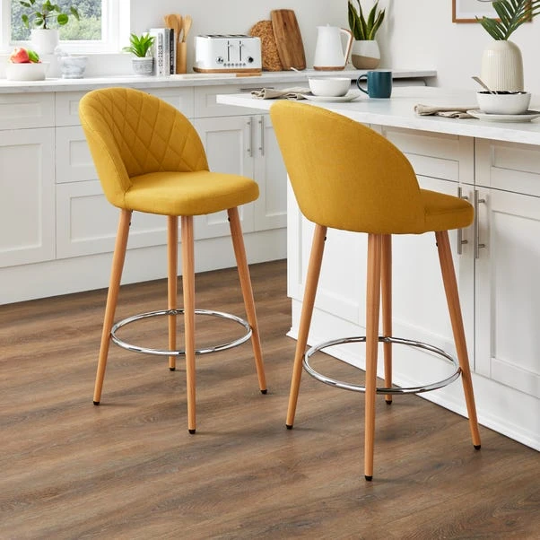 With its attractive modern design, the Astrid Bar stool would make a great addition to your kitchen or dining space. This contemporary bar stool is upholstered in a flatweave fabric and features an elegant quilted design, curved seat and a foam padded seat and backrest for added comfort. This bar stool is quick and easy to assemble and comes complete with modern Scandi style legs and a round chrome footrest.