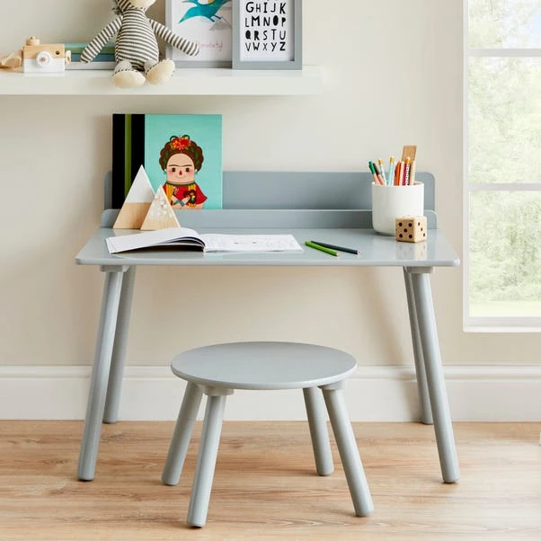 Featuring a clean and simple look, this desk and stool set comes complete with everything your little one would need for completing activities such as reading and drawing. Crafted with a strong wooden desk and sturdy legs, with a comfortable matching round stool. Complete with a book storage space to keep the desk nice and tidy. With its gorgeous grey colourway, this set would look great in any child’s bedroom or playroom.