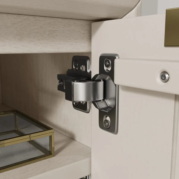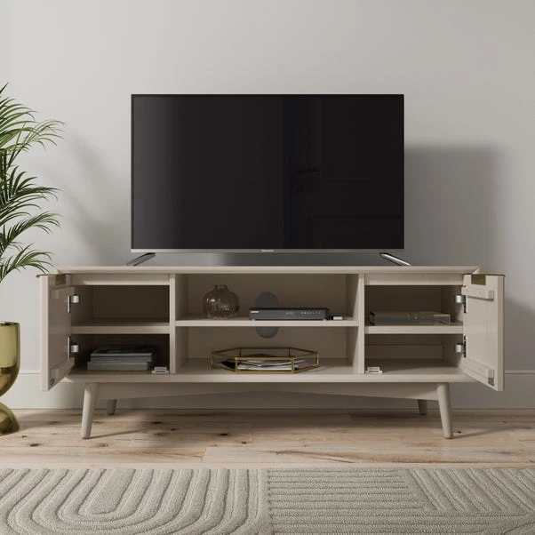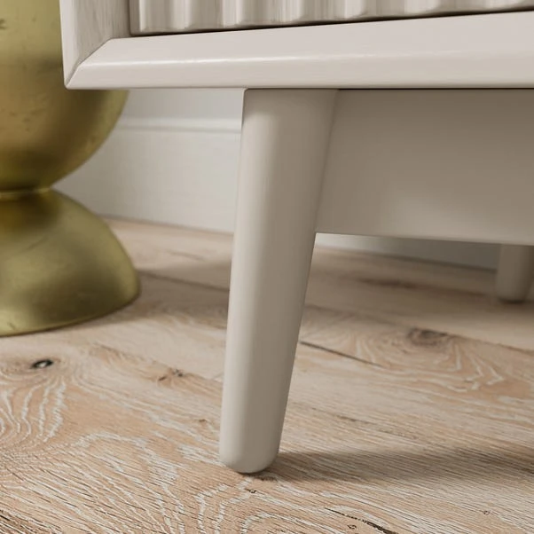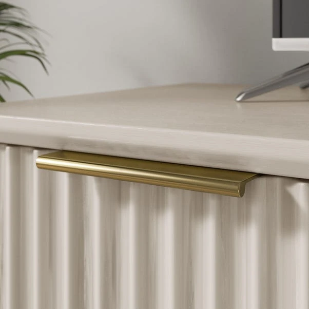 Add a little pizzazz to your living space with this fun and casual TV unit. Featuring a washed white painted finish and champagne metal handles, it’s sure to make a statement in any room. Not only is it aesthetically pleasing, but its fluted front design, open shelves, and hole for cable management make it highly functional too. Whether you’re setting up the perfect entertainment centre or just need a little extra storage space, this TV bench is sure to be the talk of the town!