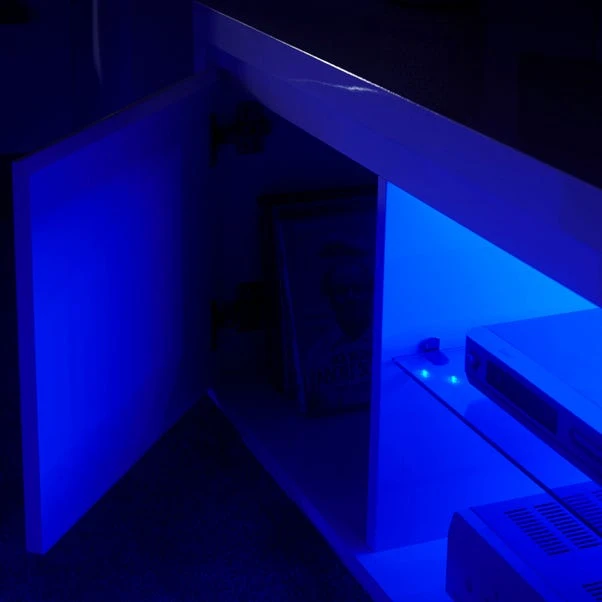 Perfect for any modern living space, the Polar LED TV unit is available in grey and white and features a moisture-resistant high gloss finish and is supplied with battery-operated LED lights, perfect for illuminating items stored beneath or to provide a subtle mood lighting. This self-assembly TV stand features two fixed open shelves, each with cable access and a spacious cupboard.