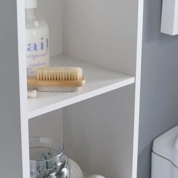 Featuring a modern, handle less design, this Tall Cabinet looks sleek and stylish, making it perfect for your bathroom space. It boasts 3 open shelves and two interior shelves, offering ample storage space for your home, meaning you can showcase your bathroom ornaments and plants whilst also internally storing all your toiletries neatly and discreetly.