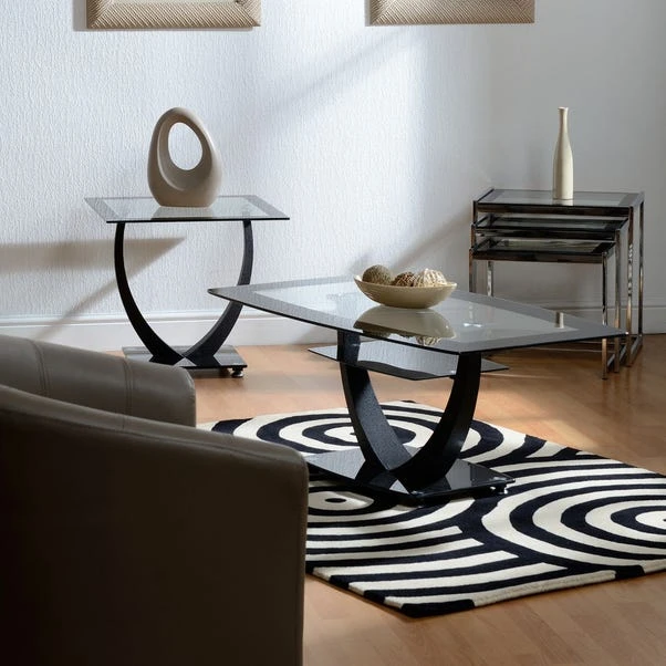 The Henley Lamp Table is sure to catch the eye in your home with its modern design and unique U-shaped frame. The clear tempered glass has a black glossy finish around the edges for that modern look while the U-shaped frame is supported on a sturdy stand.