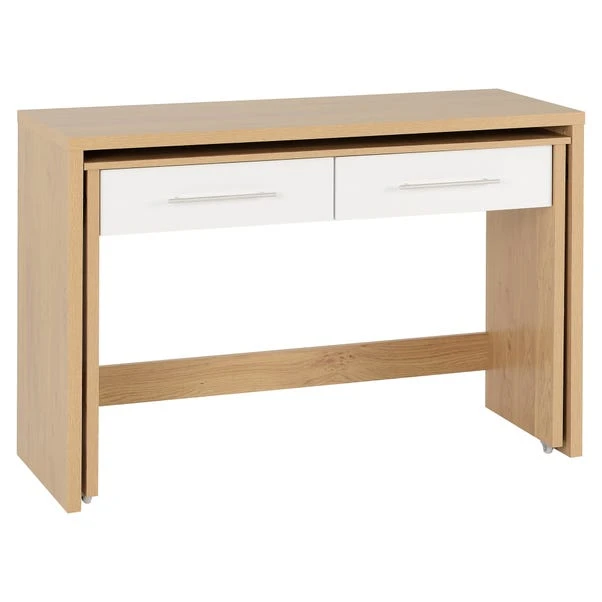 Ideal for smaller office or living spaces, the Seville slider desk makes it easy to transform any space into a home office. Thanks to the handy pull out section, you can quickly transform this desk to almost double your workspace, and then easily slide it back under to save space. This stunning self-assembly desk comes complete with two spacious drawers in a choice of white or grey fronts.